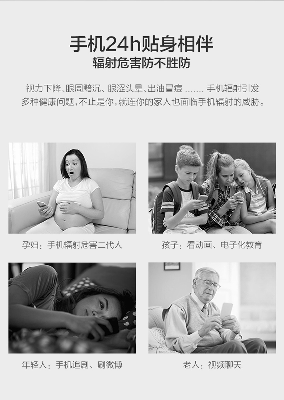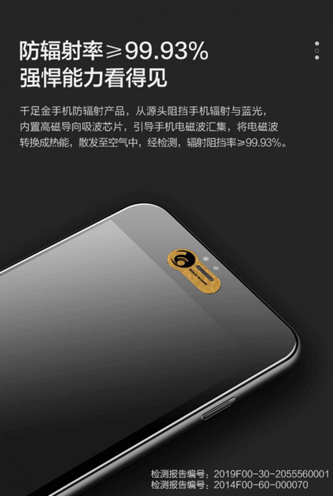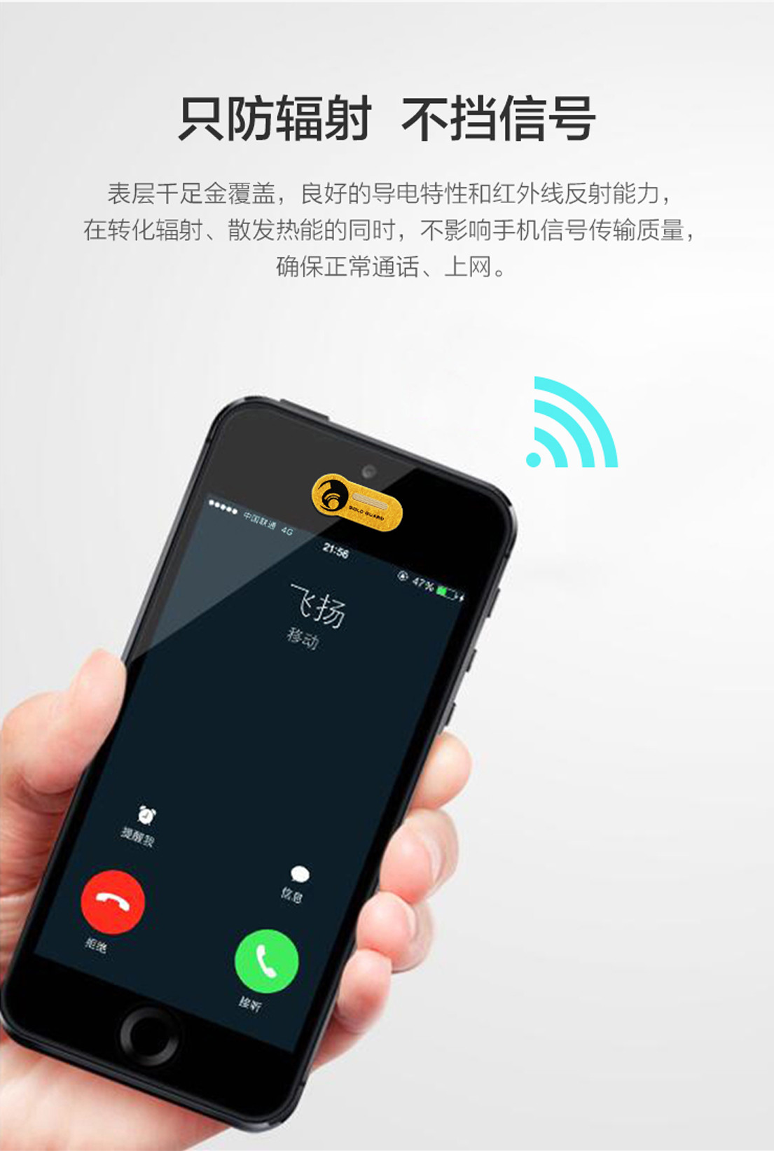 随着智能手机的普及,我们还根据手机的短波蓝光电磁波辐射的频率和波长,在产品中增加了超微粒子的金属纳米氮化物蓝光辐射吸波剂,这种材料具有强烈的表面效应,可有效的减轻手机屛幕所发出的蓝光辐射对人眼睛的伤害。另外,千足金在产品中发挥了较佳的热能吸收和散热效果,具有良好的导电性和红外线反射能力,防紫外线辐射,有着较强的防静电功能,确保通话无阻,也能较大限度消除手机辐射百分之99.93,千足金中的金离子具有通经活络,消炎杀菌,美容、美顏等功效,且具有收蒇价值。