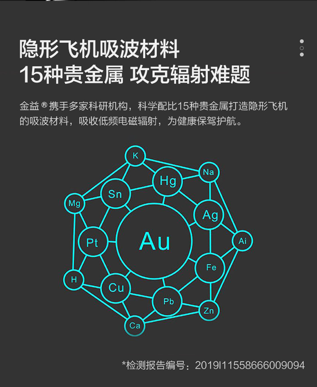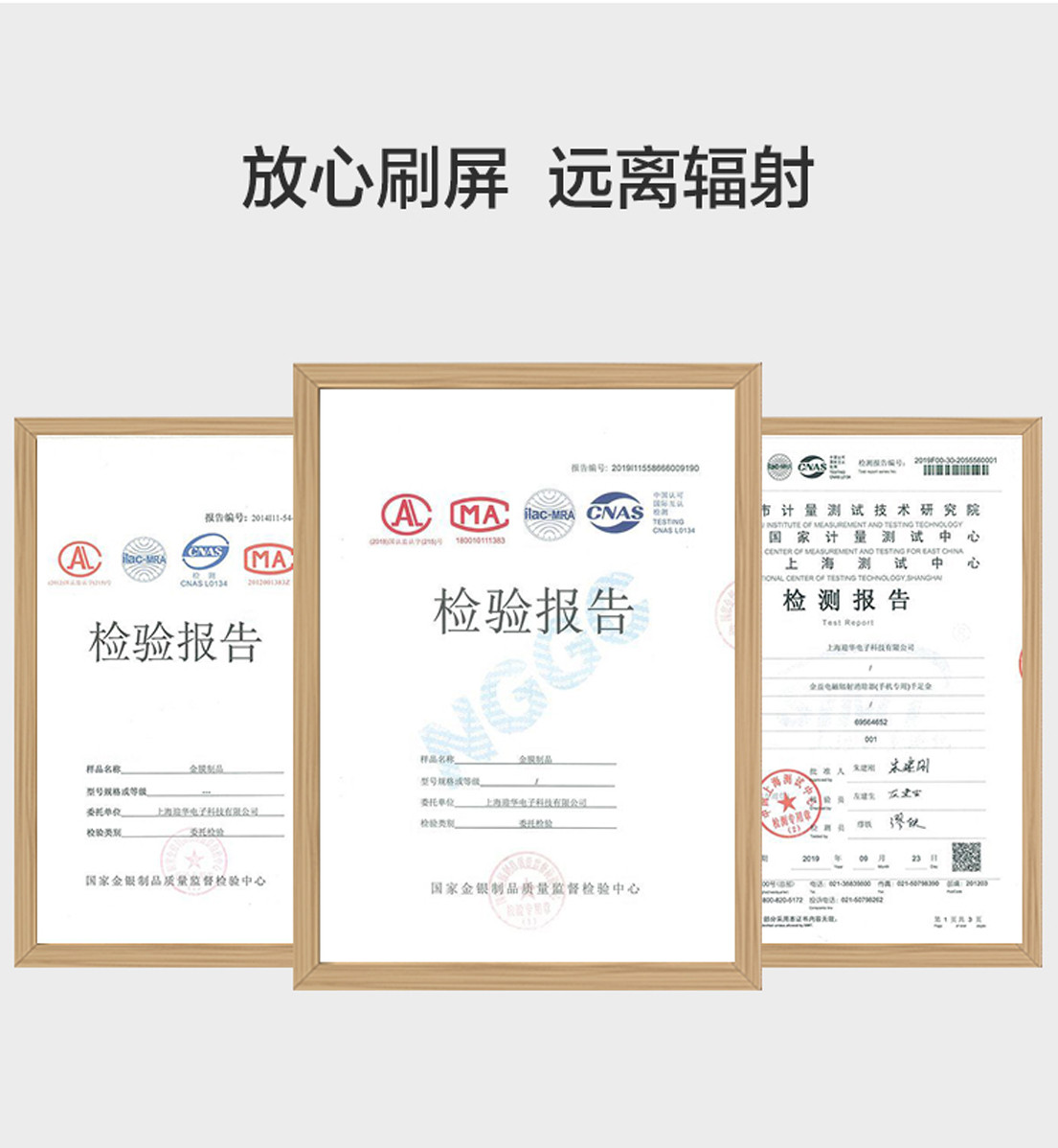 25、2019年9月【金益】产品再次通过国家金银制品质量监督检验和上海市计量测试技术研究院等三家权威部门检测,结论:金层纯度为千足金、辐射吸收效能为:百分之99.93(该检测标准全中国以及国际互检机构均认可,具有很高的权威性)。
