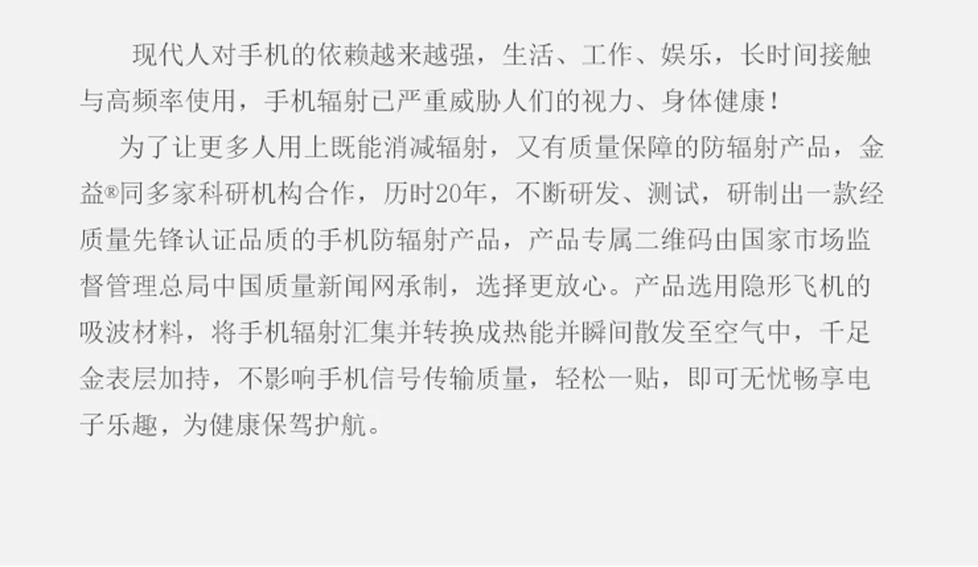 ※历年来,【金益】产品不断取得各级权威部门颁发的产品检测报告以及各个别的荣誉,并先后走进电视台并接受央视主持人的新闻采访、新华社、国务院新闻、钓鱼台国宾馆,是上海世博会、世界健康博览会指定的手机防辐射产品。该产品已被众多国家层面会议和活动确定为公认的健康礼品,同时【金益】荣获:中国2011年(上海)世界健康博览会金奖。金益牌千足金手机防辐射产品,是全球独一取得国家专利发明证书,专利内容中载明有着消除手机辐射功效并同时具有防手机蓝光辐射效果的健康好产品,性价比较高,是新形势下百姓的健康卫士,生命的保护神。