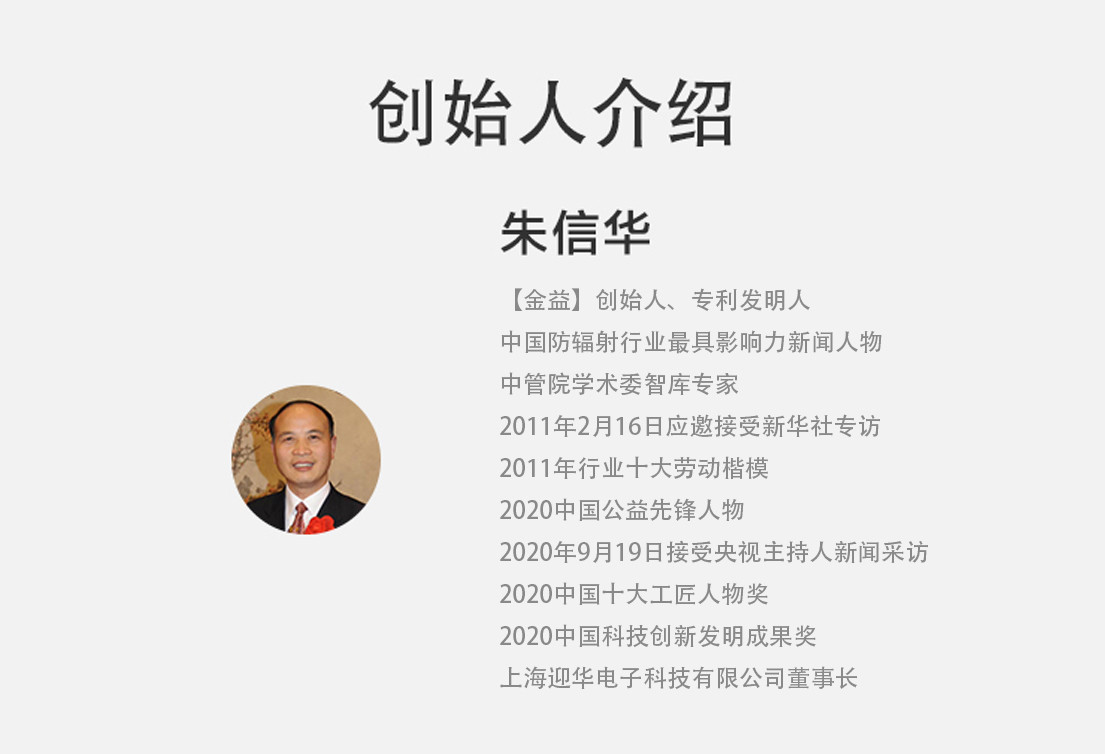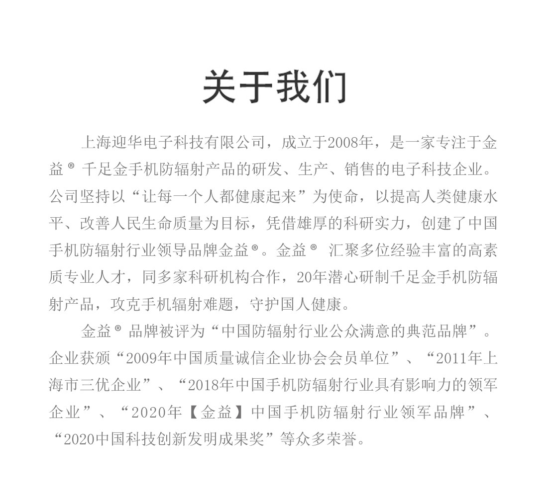 【金益】央视报道品牌,CCTV1【金益】为健康保驾护航!2014年10月22日【金益】由中国人民财产保险股份有限公司质量承保,2020年9月19日在第九届中国科学家教育家企业家论坛会上中国管理科学研究院学术委员会、中国未来研究会等三家主办单位授予:朱信华 金益牌千足金手机防辐射产品~2020中国科技创新发明成果奖。